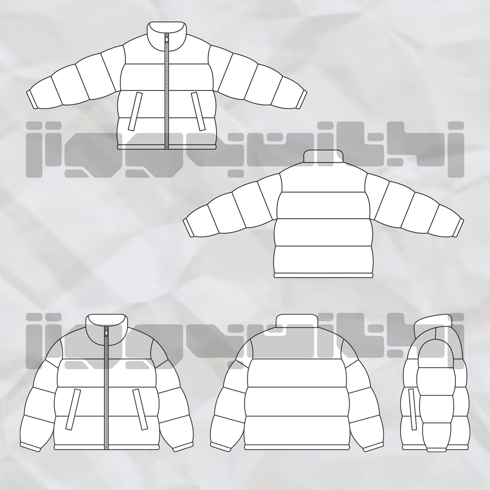 This Puffer Jacket Mockup + Tech Pack, contains technical vector mockups ideal for manufacturing custom apparel or simply experimenting with design placements.