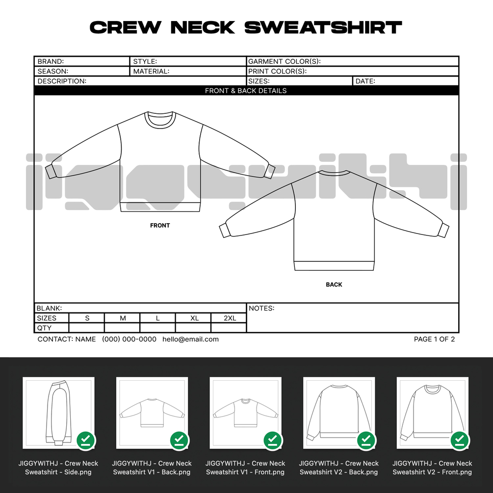 This Crew Neck Sweatshirt Mockup + Tech Pack, contains technical vector mockups ideal for manufacturing custom apparel or simply experimenting with design placements.